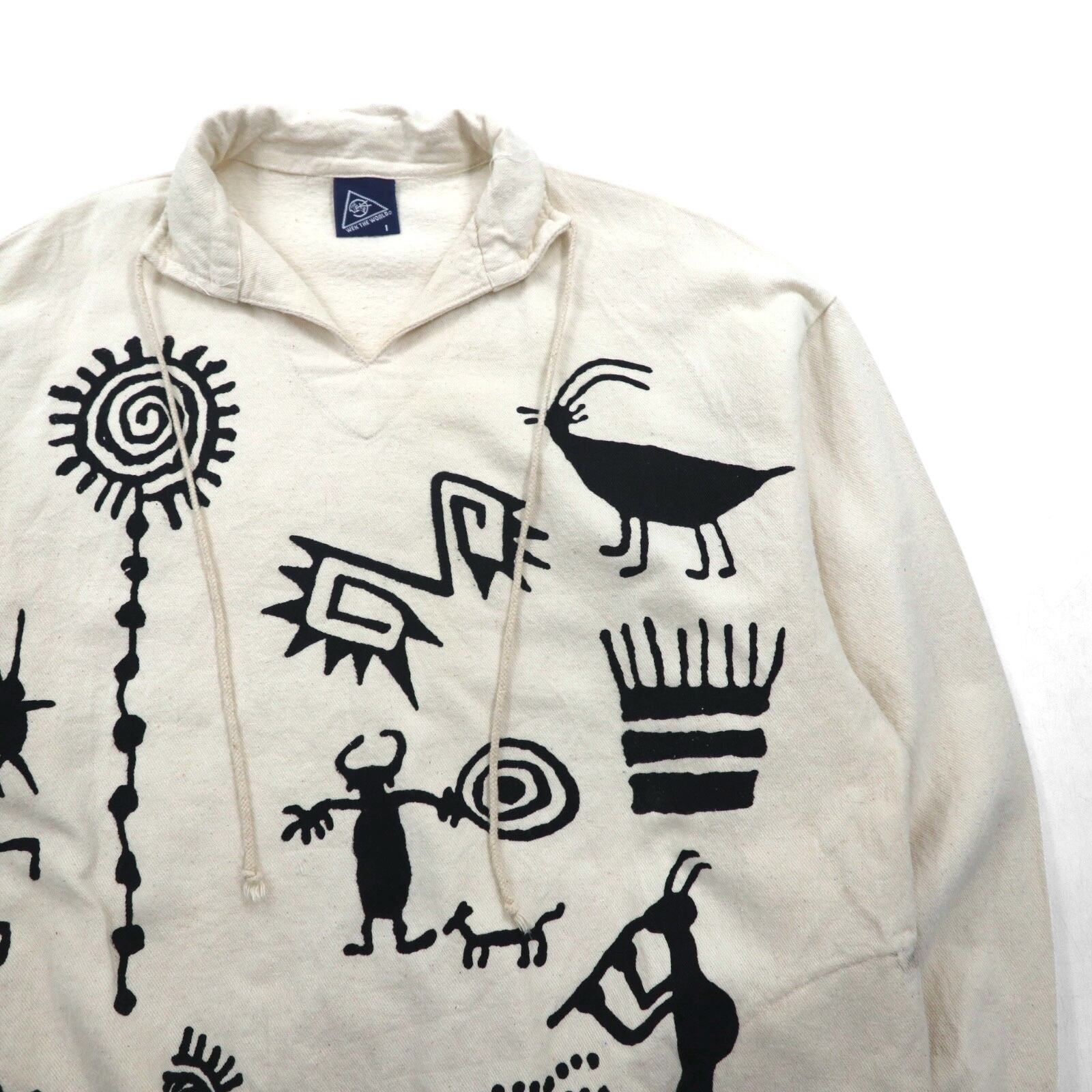 VINTAGE USA製 パーカー モックネック プルオーバー S ホワイト コットン キャンバス WEK THE WORLD ネイティブ柄