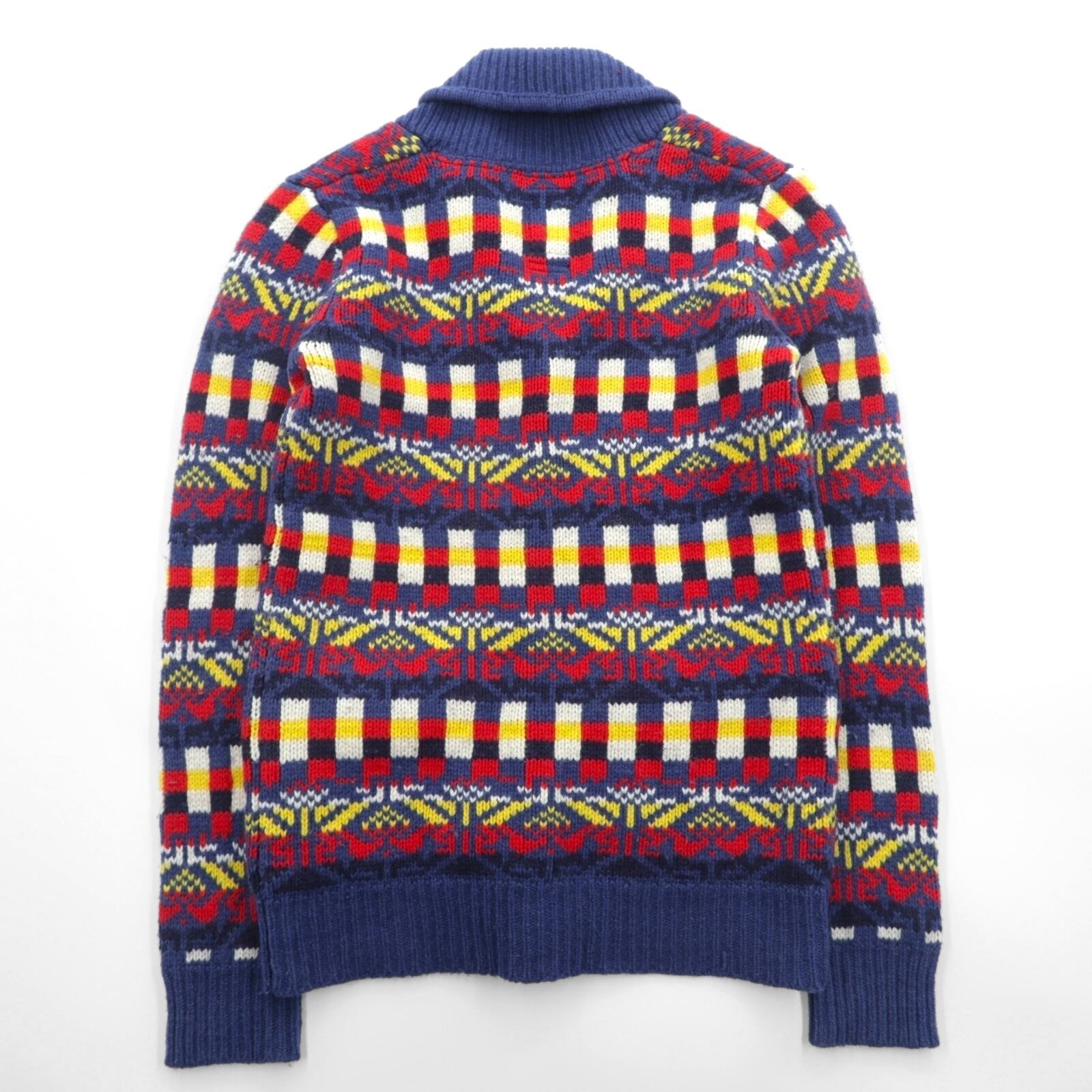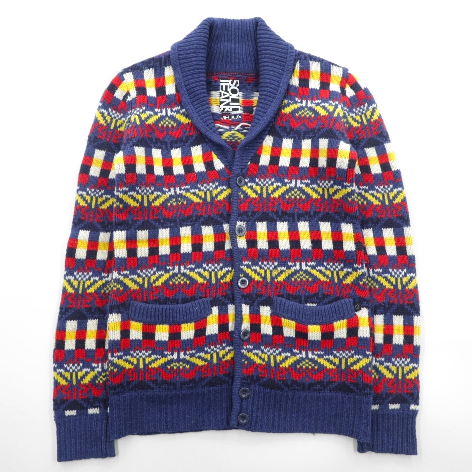 VINTAGE ニット カーディガン ショールカラー M ブルー ウール SOLID JEANS 総柄
